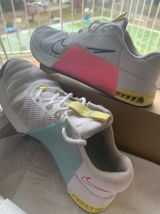 Zapatillas deportivas Nike Metcon 9 en color blanco y rosa. Usadas pero en buenas condiciones! - Diseño moderno con detalles en rosa y amarillo. - Tejido de malla transpirable. - Suela con amortiguación visible.
