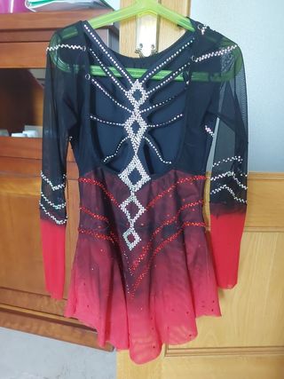 Malla a medida, decorada con svaroski . parte del pecho negro con decoración y volantes rojo. Espalda descubierta . la manga va en tirantes transparentes y caída más abajo del hombro. Hay fotos con medidas.