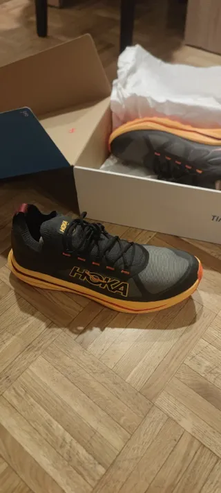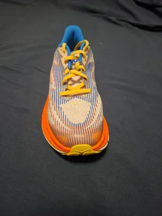 Zapatillas deportivas Hoka con un diseño vibrante. - Parte superior de malla transpirable. - Detalles en naranja y azul. - Suela de goma para mayor tracción.