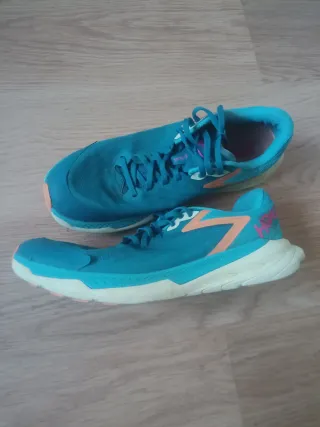 Zapatillas Hoka Zinal 2 con un diseño llamativo en azul y detalles en naranja. - Suela Vibram con uso pero todavía con un buen agarre. - Cierre con cordones. - Parte superior de malla transpirable.