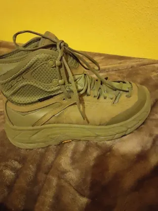 Botas de montaña Hoka en color verde oliva. Diseñadas para ofrecer comodidad y soporte en terrenos irregulares. - Parte superior de malla transpirable. - Suela de goma duradera. - Cierre de cordones.