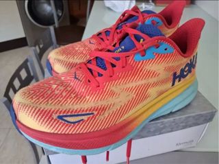 Zapatillas de running Hoka Clifton 9 en llamativos tonos rojos y amarillos. Diseñadas para ofrecer comodidad y rendimiento en cada carrera. - Parte superior de malla transpirable. - Amortiguación reactiva. - Suela de goma duradera.