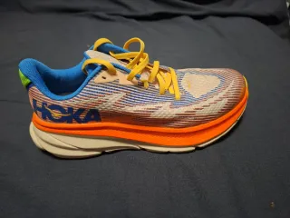 Zapatillas Hoka Clifton 9 en talla 42 2/3. Diseño moderno y cómodo. - Parte superior de malla transpirable. - Amortiguación para confort. - Suela de goma duradera. Desgaste habitual de un año.