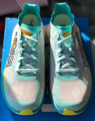 Hoka Cielo Road, un calzado de running ultraligero y de alto rendimiento diseñado específicamente para competiciones de corta distancia, como 5K y 10K Marca: Hoka Modelo: Cielo Road Diseño: Zapatilla de competición minimalista y ajustada, pensada para la velocidad. Mediasuela: Incorpora espuma PEBA ligera y reactiva para un retorno de energía eficiente, pero carece de placa de carbono. Empeine: Malla de ventilación abierta y minimalista hecha de poliéster 100 % reciclado, que proporciona un ajuste seguro y transpirabilidad. Suela: Suela de caucho con un perfil bajo (drop de 3 mm), diseñada para un agarre excelente y una buena sensa