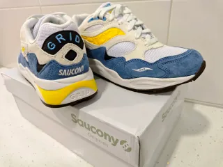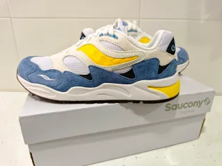 Zapatillas deportivas Saucony Grid Shadow con un diseño moderno y llamativo. - Combinación de colores azul y amarillo. - Paneles de ante y malla. - Suela blanca con detalles amarillos.