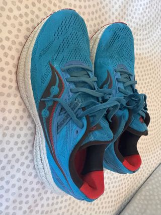 Zapatillas deportivas Saucony Triumph en talla 42.5. Han tenido muy poco uso y se encuentran en buen estado. - Diseño en color azul con detalles en rojo. - Parte superior de malla transpirable. - Suela con amortiguación. - Cierre de cordones.