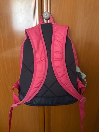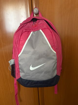 Mochila de la marca Nike con un diseño moderno en tonos rosa y gris. - Compartimento principal con cierre de cremallera. - Bolsillo lateral de malla. - Correas ajustables para los hombros.