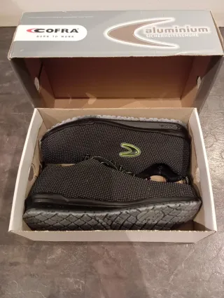 Calzado de seguridad Cofra en color negro con detalles en verde. Diseñados para ofrecer protección y comodidad. - Material exterior de malla transpirable. - Suela de goma antideslizante. - Cierre con cordones. - Utilizado en pocas ocasiones