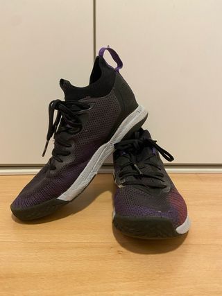 Zapatos de baloncesto con un diseño moderno y llamativo. - Parte superior de malla transpirable. - Detalles en color morado. - Suela de goma para mayor tracción.