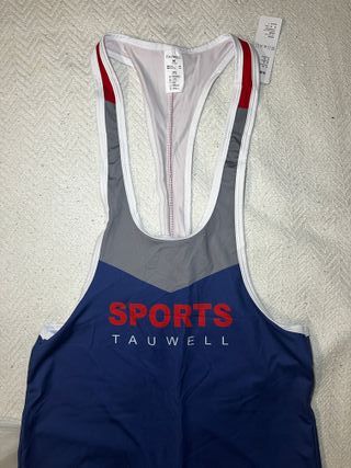 Mallas deportivas con un diseño vibrantes y moderno, ideales para la práctica de lucha o entrenamiento en el gimnasio. El tejido es ligero y permite total libertad de movimiento. - Diseño con detalles en rojo y blanco sobre fondo azul. - Corte tipo maillot con tirantes. - Abertura en la entrepierna.