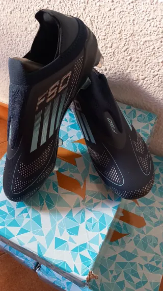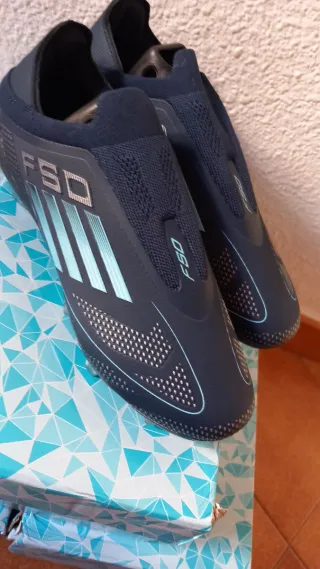 Botas de fútbol F50 en color azul y verde azulado. Diseñadas para un rendimiento óptimo. - Diseño sin cordones. - Detalles de malla transpirable. - Tiras icónicas en contraste.