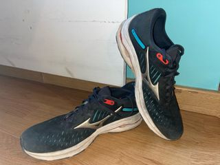 Zapatillas deportivas Mizuno Wave Rider 24 en talla 42.5. - Parte superior de malla transpirable. - Suela con tecnología Wave para amortiguación. - Detalles en color azul y rojo. Tienen algún signo de desgaste pero la suela está muy bien, les queda mucho recorrido