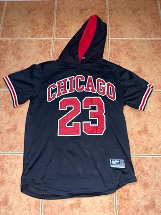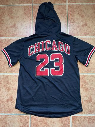 Sudadera con capucha de manga corta con el número 23 y el nombre de Chicago. 📤ENVÍO 24/48h ⭐️NEGOCIABLE - Color negro. - Capucha con forro rojo. - Ribetes blancos y rojos en las mangas. - Tejido de malla