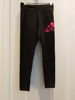 Mallas deportivas Adidas con un llamativo logo. - Color negro. - Talla S (equivalente a 34/36). - Logo de Adidas en color rosa brillante.
