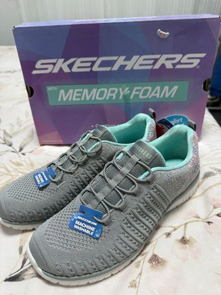 Zapatillas Skechers para mujer en color gris con detalles multicolor. Cuentan con plantilla de espuma viscoelástica para mayor comodidad. - Parte superior de tejido de malla. - Suela de goma. - Cierre de cordones elásticos. - Aptas para lavar a máquina.