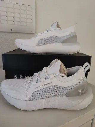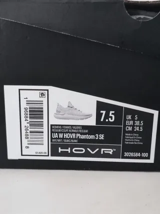 ¡Zapatillas Under Armour UA W HOVR Phantom 3 SE para mujer completamente NUEVAS, sin estrenar, con caja original! Color blanco con detalles plata/gris (white/halo grey), modelo 3026584-100, fabricadas en China. Talla EU 38.5 (US 7.5, UK 5, 24.5 cm), perfectas para running en asfalto, caminar, gimnasio o uso diario gracias a la amortiguación UA HOVR™ que reduce el impacto y devuelve energía en cada pisada. 3Upper UA IntelliKnit ligero y transpirable con refuerzos de malla y espuma en el mediopié para mayor estructura y sujeción, plantilla cómoda y suela de goma con buen agarre y durabilidad. Diseño moderno tipo calcetín, muy cómodas