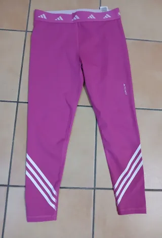 Mallas deportivas Adidas de color fucsia, ideales para entrenar. - Cintura elástica con logo. - Tres rayas blancas en los tobillos. - Tecnología Techfit Aeroready - Tejido lycra y ligeramente perforado en las pantorrillas