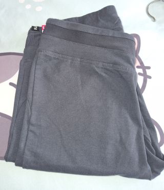 Conjunto de pantalones y mallas de diferentes colores. - Pantalones vaqueros talla 36 Bershka, corte un pelín acampanado abajo con los bajos cortados, venían así de tienda. - Mallas negras talla S o XS. - Mallas grises Bershka talla M - Pantalón de chándal básico blanco algodón S. -mallas tipo pantalón color negro ligero y de vestir S. - mallas tipo cuero que no se rompen, al menos a mí no se me han roto y las he usado varias veces S. Está todo en buen estado pero se me han quedado pequeñas.