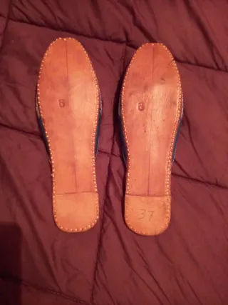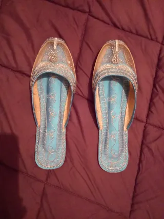Elegantes zapatillas de fiesta con un diseño llamativo. Cuero - Adornadas con pedrería y detalles plateados. - Acabado en malla plateada en la punta. - Interior en tono azul brillante.