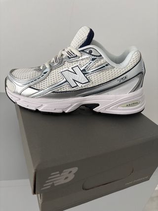 Zapatillas New Balance modelo 740 en talla 38. - Diseño deportivo en tonos plateados y blancos. - Parte superior de malla transpirable. - Detalle del logo 'N' en los laterales. - Suela con tecnología ABZORB.