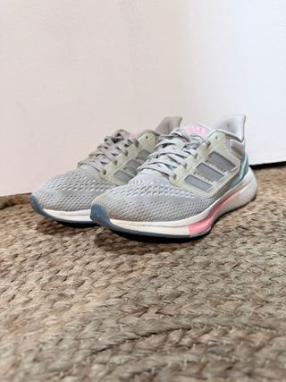 Zapatillas deportivas Adidas en tonos grises con detalles en rosa y turquesa. - Diseño moderno y cómodo. - Parte superior de malla transpirable. - Suela con amortiguación. - Cierre de cordones.
