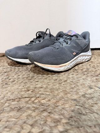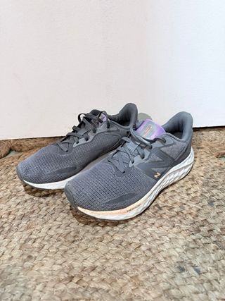 Zapatillas deportivas New Balance en tonos grises con detalles en rosa. - Diseño moderno y cómodo. - Parte superior de malla transpirable. - Suela con tecnología Fresh Foam.