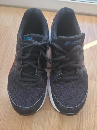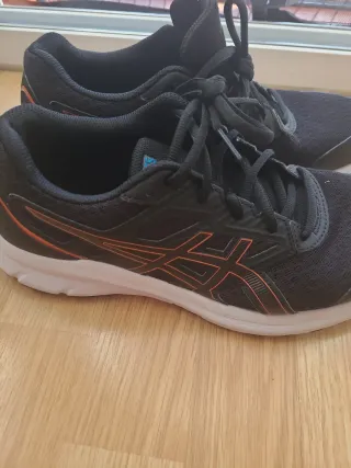 Zapatillas deportivas Asics con un diseño moderno y llamativo. - Combinación de colores negro y naranja. - Cierre con cordones. - Parte superior de malla transpirable. Talla 41.5