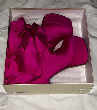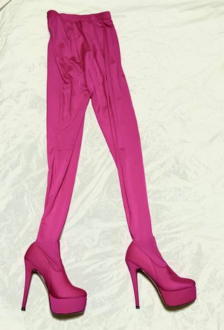 Conjunto de mallas con tacones de color rosa intenso. El diseño combina una prenda de vestir con calzado de plataforma y tacón alto. En su caja original. - Mallas elásticas. - Tacones de plataforma. - Diseño integrado.