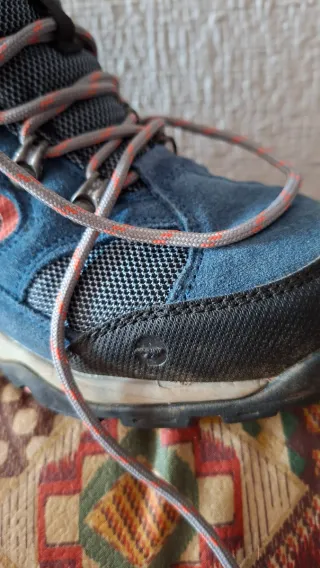Botas de trekking con un diseño moderno y detalles llamativos. - Material exterior de ante y malla. - Cordones resistentes con detalles naranjas. - Suela de goma para un buen agarre. Poco uso lo que se ve en la punta es resto de arena no están roto y el.circulo es la.marca