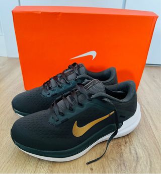 Zapatillas deportivas Nike Air Winflo 10 para mujer/niña. Precio en tienda 80-90€. Incluye caja. El Nike Air Winflo 10 tiene un ajuste seguro que mantiene el pie en su lugar a medida que pasan los kilómetros. Agregamos mucha espuma a través de la entresuela - Diseño en color negro con detalles dorados. - Parte superior de malla transpirable. - Suela con amortiguación. - Cierre de cordones.