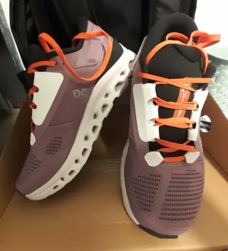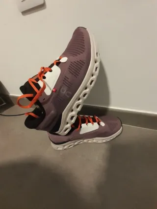 Zapatillas deportivas de la marca On Running. Importante: talla 40, pero como si fuera 39 - Diseño moderno en tonos morados y detalles naranjas. - Parte superior de malla transpirable. - Suela con tecnología CloudTec®.