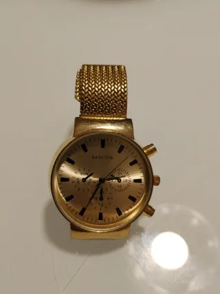 Elegante reloj de pulsera para mujer de la marca Parfois. - Esfera dorada con detalles. - Correa de malla metálica dorada. - Diseño moderno y sofisticado.