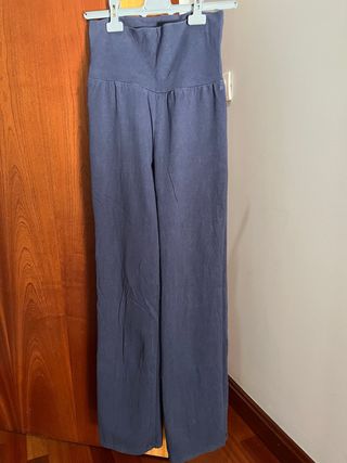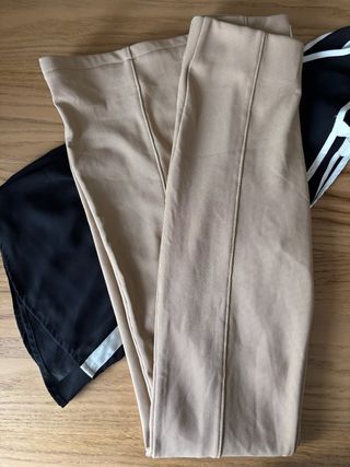 Pantalón tipo malla en color beige, elástico y muy cómodo. Tiene un pelín de campana y costura frontal que estiliza la pierna. Usado solo un par de veces, en muy buen estado y sin desperfectos. Fácil de combinar para looks diarios o más arreglados.