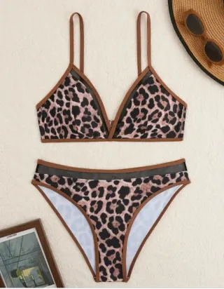 Maravilloso conjunto de bikini con un llamativo estampado de leopardo, tendencia actual. Talla L. Nuevo, a estrenar. - Diseño triangular en el top. - Detalles de malla semitransparente. - Ribetes en contraste.