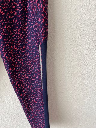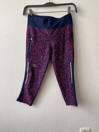 Mallas deportivas de la marca Kalenji, con un diseño estampado en tonos morados y rosas. - Largo hasta la rodilla. - Cintura elástica. - Detalle de cremallera en un lateral. - Tira reflectante en la parte inferior de las piernas.