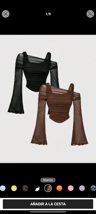 Conjunto de dos camisetas de malla con diseño asimétrico y mangas acampanadas. - Una camiseta es negra y la otra marrón. - Tejido de malla transparente. - Diseño fruncido. - Corte asimétrico con un hombro descubierto.