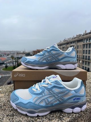 Zapatillas deportivas ASICS GEL NYC en tonos azules y blancos. Diseño moderno y cómodo. - Parte superior de malla y ante. - Detalle de las icónicas rayas de ASICS en los laterales. - Suela con tecnología GEL para una amortiguación óptima.
