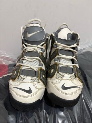 Zapatillas deportivas Nike Air More Uptempo en tonos grises y blancos. Un diseño icónico con detalles llamativos. originales, no las he usado mucho - Parte superior de cuero y malla. - Sistema de amortiguación visible. - Cierre con cordones.