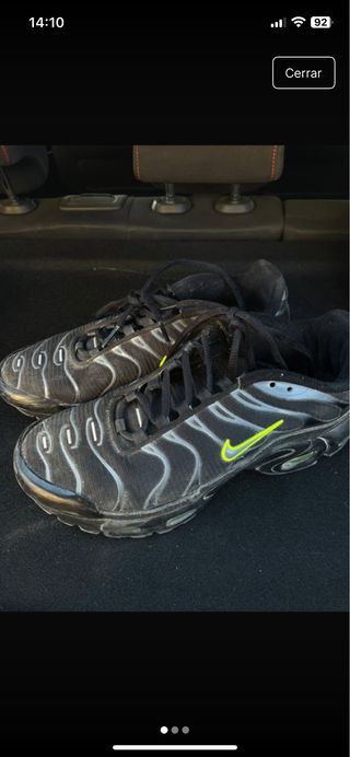 Zapatillas Nike TN Air Max Plus en color negro con detalles en verde neón. - Diseño icónico con líneas onduladas. - Malla transpirable en la parte superior. - Suela con amortiguación Air Max. - Logotipo Swoosh en verde neón.