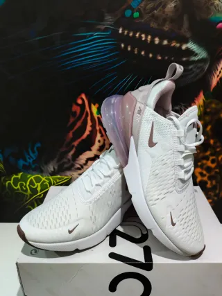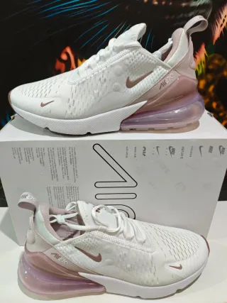 Zapatillas Nike Air Max 270 en color blanco con detalles en morado. Nuevas y originales 💯 Caja original sin tapa Zapatillas Nike mujer - Diseño moderno y cómodo. - Unidad Air Max visible en el talón. - Parte superior de malla transpirable.
