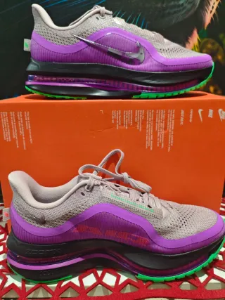 Zapatillas deportivas Nike Pegasus Premium FK en llamativos tonos morado y verde. Diseñadas para ofrecer comodidad y estilo. Nuevas sin estrenar Originales 💯 Caja original sin tapa Nike Running - Parte superior de malla transpirable. - Detalles en color verde brillante en la suela. - Swoosh de Nike en los laterales.