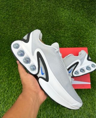Zapatillas Nike con un diseño moderno y detalles llamativos. - Parte superior de malla transpirable. - Suela con unidades de amortiguación visibles. - Detalles en color azul y negro.