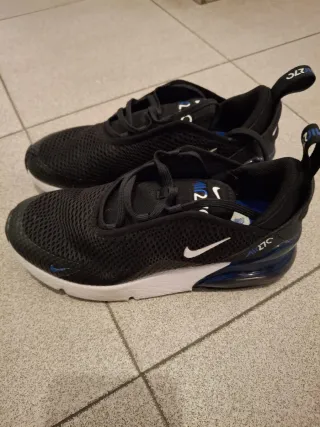 Zapatillas deportivas Nike Air Max 270. - Diseño moderno en color negro con detalles en azul. - Suela con unidad Air Max visible para mayor amortiguación. - Parte superior de malla transpirable.