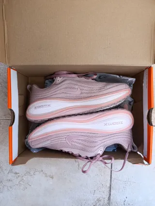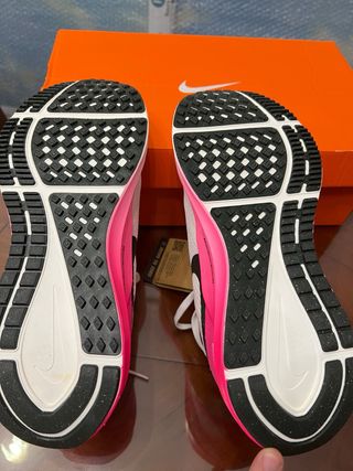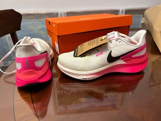 Zapatillas deportivas Nike Structure 25 en talla 40.5. - Diseño moderno en blanco y rosa. - Parte superior de malla transpirable. - Suela con tecnología Zoom Air para mayor amortiguación.