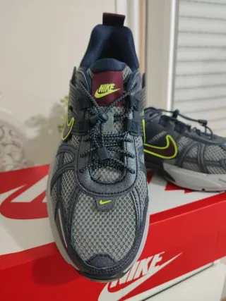 Zapatillas deportivas Nike V2k para mujer en tonos azules y grises. Diseño moderno y cómodo. - Parte superior de malla transpirable. - Detalles en color neón. - Suela de goma para mayor tracción. -Muy poco uso. Perfecto estado.