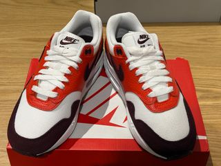 Zapatillas deportivas Nike Air Max 1 con un diseño llamativo. - Combinación de colores rojo, blanco y granate. - Paneles de cuero y malla. - Suela con unidad Air visible.