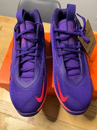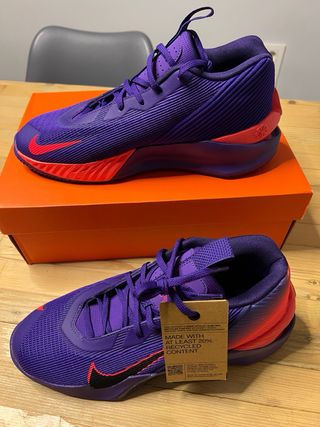 Zapatos de baloncesto Nike con un diseño llamativo. - Parte superior de malla transpirable. - Detalles en color morado y azul claro. - Suela con tecnología Zoom Air.