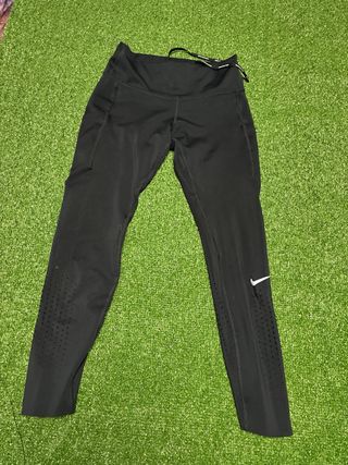 Mallas técnicas Nike Running de la gama Epic Luxe, diseñadas específicamente para correr o entrenamientos de alta intensidad. Son de color negro, con un ajuste compresivo y tejido Dri-FIT que capilariza el sudor. Características principales: • Ventilación Premium: Zonas con perforaciones cortadas a láser en la parte inferior de las piernas para mayor transpirabilidad. • Almacenamiento: Incluye bolsillo trasero con cremallera (ideal para el móvil o llaves) y bolsillos laterales abiertos de fácil acceso. • Ajuste: Cintura media-alta con cordón interior ajustable para que no se bajen al correr. • Visibilidad: Logo de Nike (Swoosh) refl