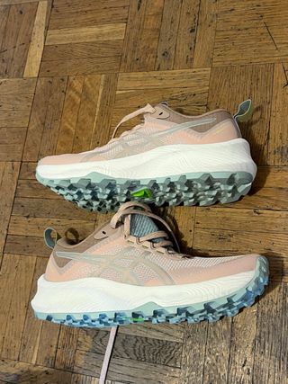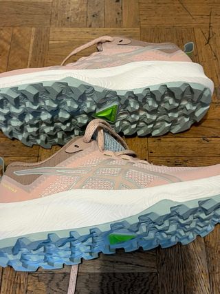 Zapatillas de running Asics para mujer en tonos rosa y azul. Diseñadas para trail running. - Parte superior de malla transpirable. - Suela de goma con buen agarre. - Cierre de cordones.