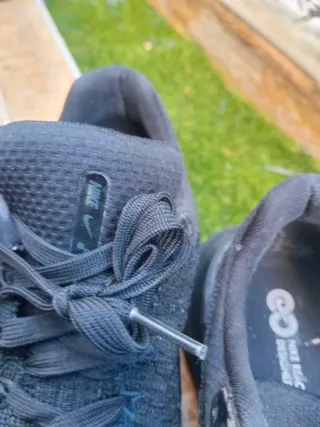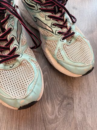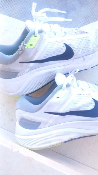 Zapatillas de running Nike Pegasus 41 en talla 43 en color blanco y azul. De estar metidas en un zapatero sin utilizar una de ellas ha oscurecido un poco por arriba, pero están como se ven nuevas sin estrenar - Diseño moderno y ligero. - Malla transpirable para mayor comodidad. - Suela con tecnología Zoom Air para amortiguación. - Cierre con cordones para un ajuste seguro.
